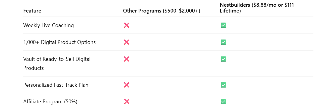 Other programs charge hundreds or even thousands for a fraction of what you get here. Nestbuilders gives you everything—training, tools, coaching, and a built-in affiliate program—for less than the cost of a Netflix subscription.